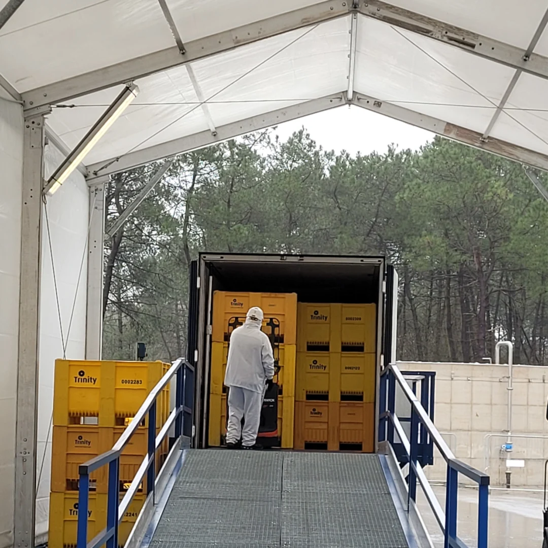 En attendant la construction d’un bâtiment permanent, notre équipe a mis en place une solution rapide et efficace : un tunnel de déchargement en location. Cette structure temporaire mesure 7x20m avec une hauteur utile de 5m, ce qui permet le déchargement des poids-lourds.