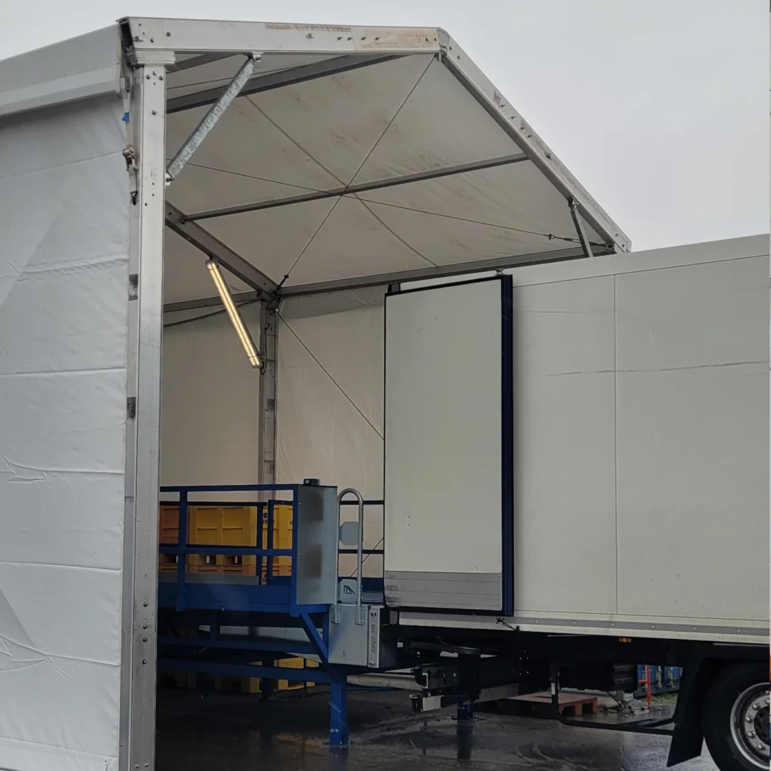 Le montage de cette installation a été réalisé directement au-dessus d’une plateforme de déchargement existante. Cette configuration garantit un accès facile pour les poids-lourds et engins de manutention, tout en protégeant les marchandises des intempéries.